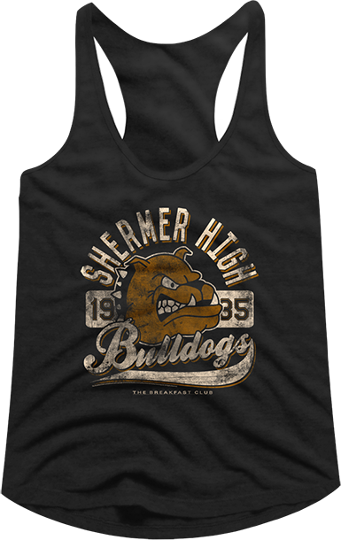 This ladies slim fit Breakfast Club tank top features an image of a bulldog. This is the mascot for Shermer High, the school where five strangers spent their detention in the 1985 John Hughes classic.