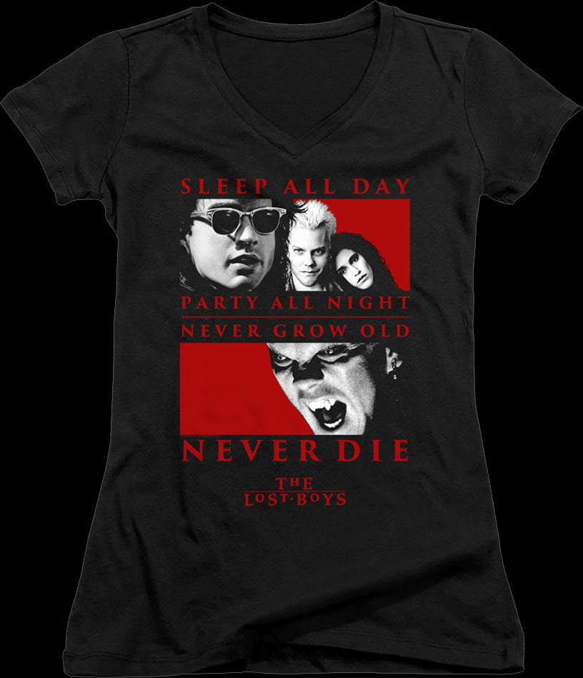 This ladies V-neck Lost Boys shirt features images of Michael Emerson, Star and David. The shirt reads, "Sleep All Day, Party All Night, Never Grow Old, Never Die."