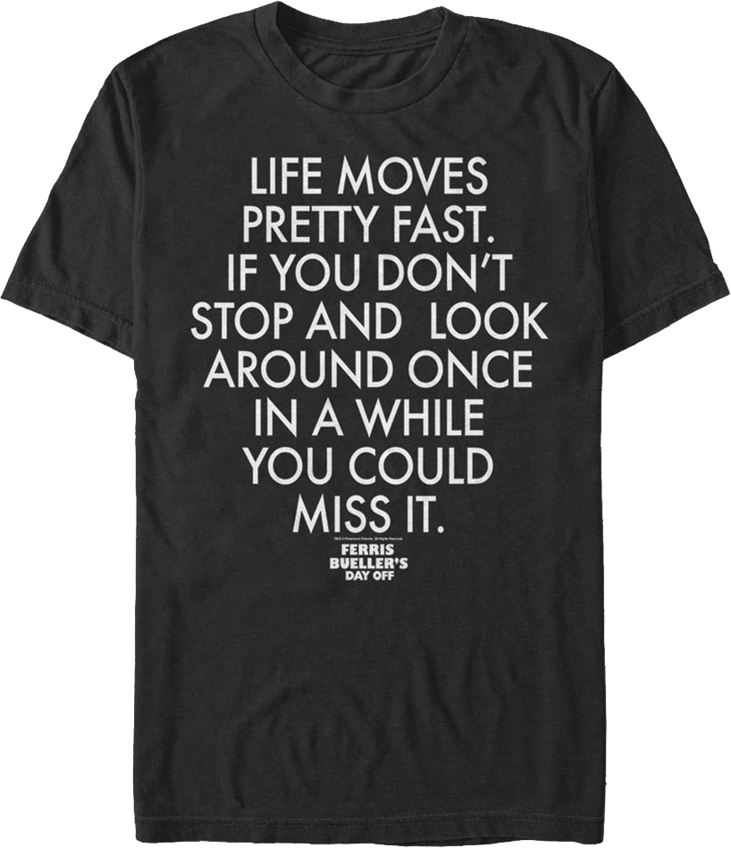 After successfully skipping school and spending a day in Chicago with his friend and girlfriend, Ferris Bueller made it home before he could be caught by his parents. At the end of the movie said to the audience, "Life moves pretty fast. If you don't stop and look around once in a while, you could miss it." Let everyone know that you are a fan of the John Hughes classic staring Matthew Broderick with this Life Moves Pretty Fast Quote Ferris Bueller's Day Off T-Shirt!