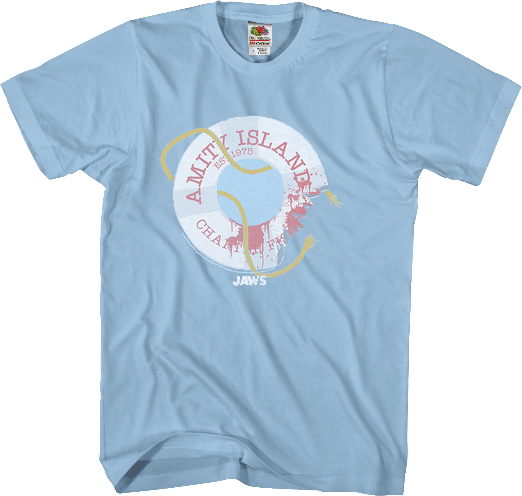 This Jaws t-shirt shows a bloody Amity Island life preserver that has been bitten by a great white shark.