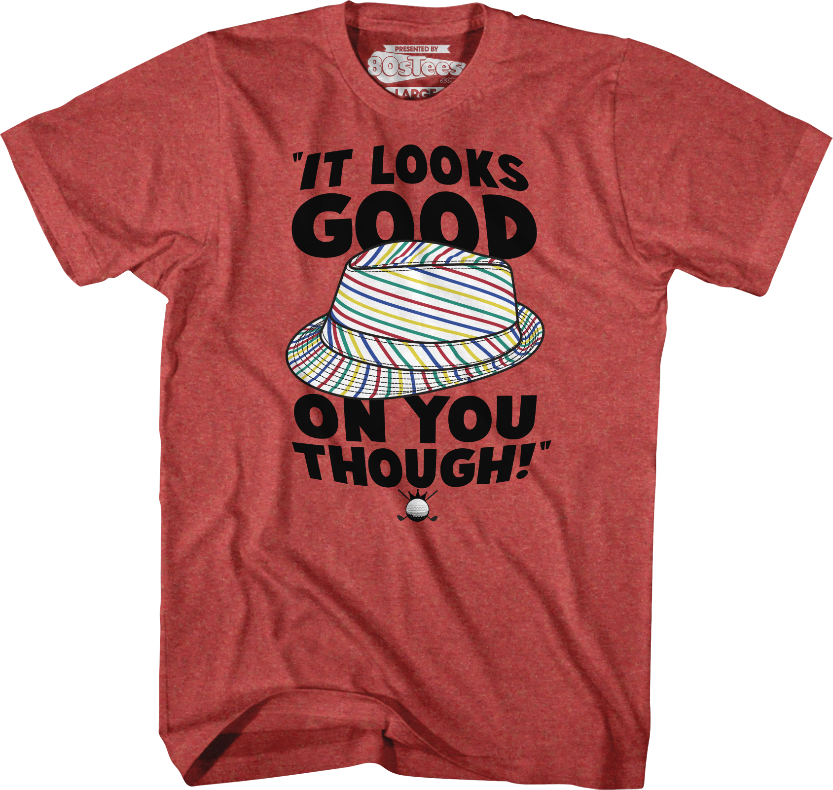This 80sTees.com exclusive Caddyshack t-shirt shows the pinstriped hat that Al Czervik found at the Bushwood County Club's gift shop. Al took one look at the hat and said, "This is the worst looking hat I ever saw. You buy a hat like this, I bet you get a free bowl of soup". Just then, Al saw that Judge Elihu Smails was wearing the same exact hat, and Al said, "It looks good on you though".