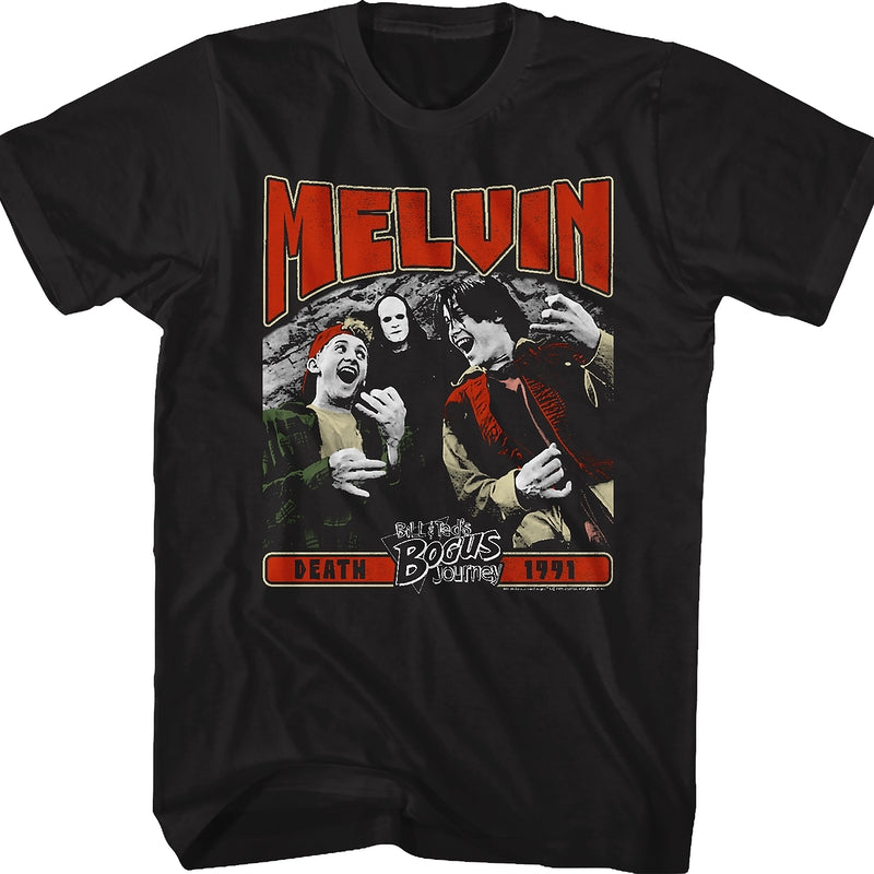 This Bill And Ted t-shirt features an image of Bill S. Preston and Ted Logan playing air guitars as they meet Death off below the cliff at Vasquez Rocks. The shirt reads MELVIN.