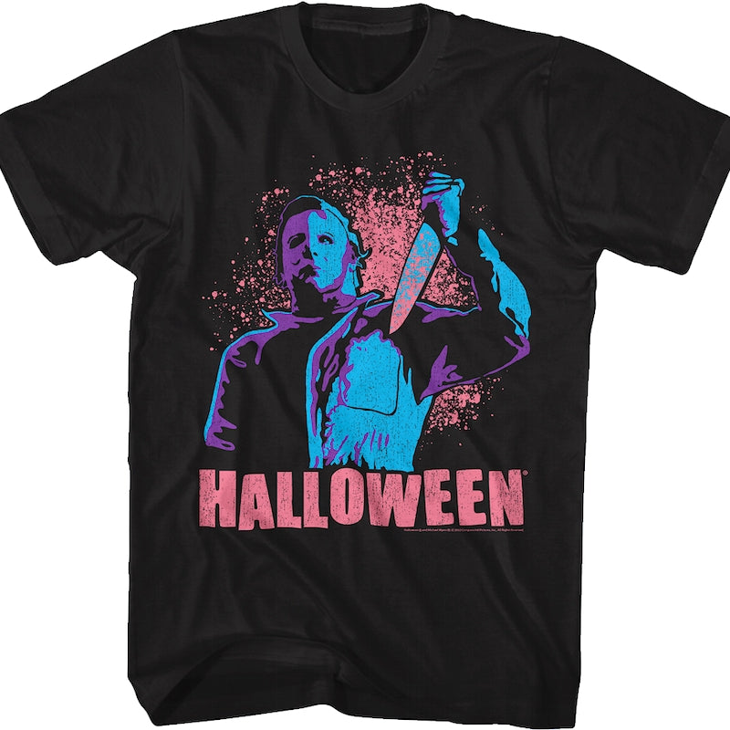 This Halloween t-shirt features an image of Michael Myers posing with his bloody butcher knife. The image is highlighted in neon colors.