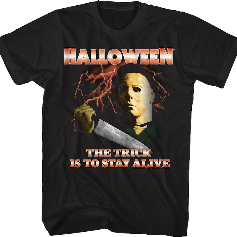 This Halloween t-shirt shows lightning bolts flashing as Michael Myers holds a butcher knife. The shirt includes the movie tagline, "The Trick Is To Stay Alive".
