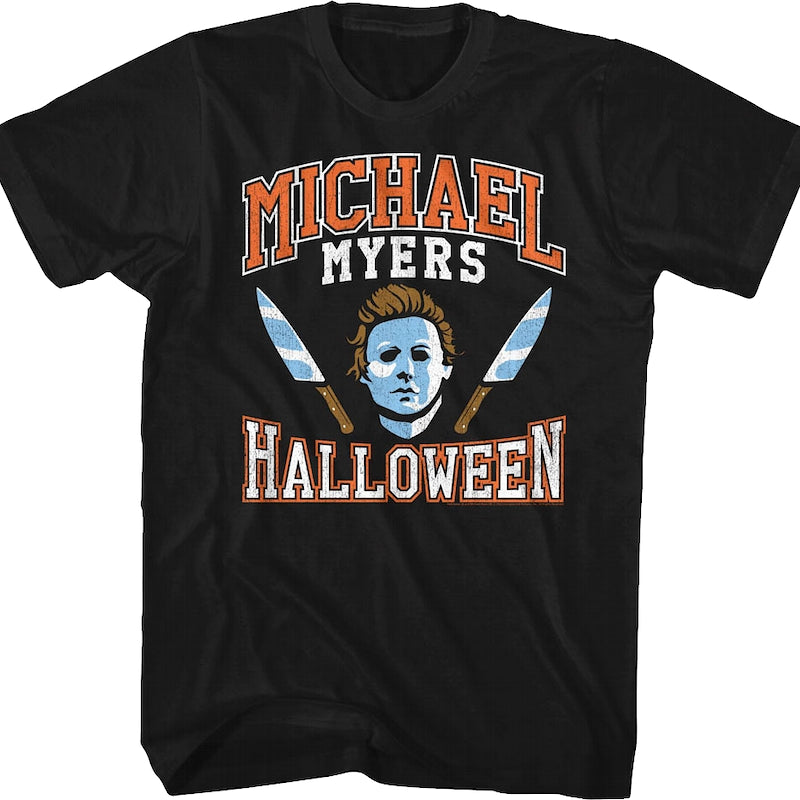 Michael Myers Mask And Knives Varsity Logo Halloween T-Shirt
