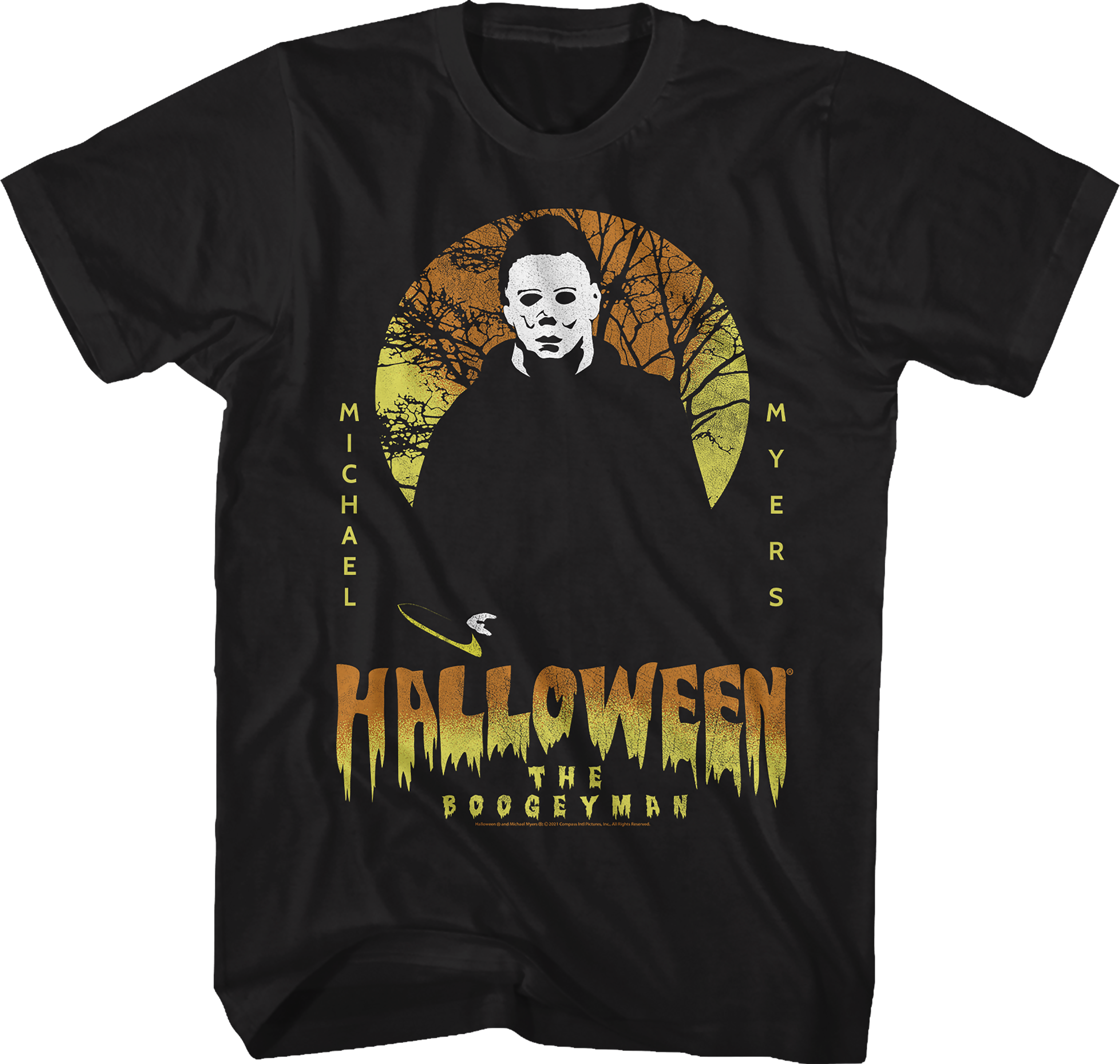 This Halloween t-shirt features an illustrated image of Michael Myers posing with a knife in front of a full moon. The shirt includes Michael's nickname, The Boogeyman.