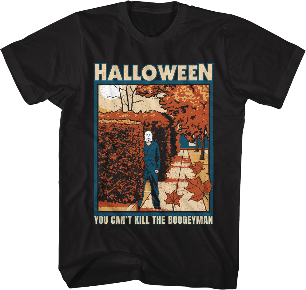 This Halloween t-shirt features an illustration of Michael Myers hiding behind bushes in Haddonfield, Illinois. The shirt reads You Can't Kill The Boogeyman.