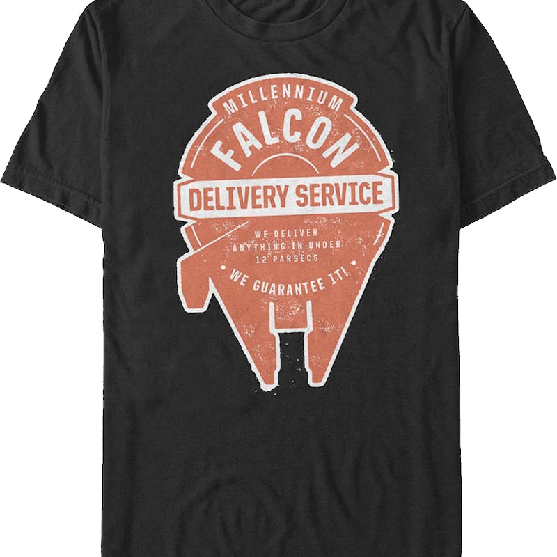 This Star Wars t-shirt features an outline of the Millennium Falcon, and reads Millennium Falcon Delivery Service. We Deliver Anything In Under 12 Parsecs. We Guarantee It!