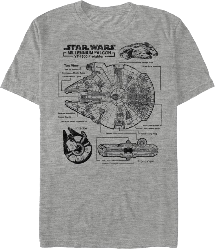 As the smuggling ship piloted by Han Solo and Chewbacca, the Millennium Falcon is one of the most iconic images from the Star Wars franchise. Everyone will know you are a fan when you wear this Millennium Falcon Schematic Star Wars T-Shirt!