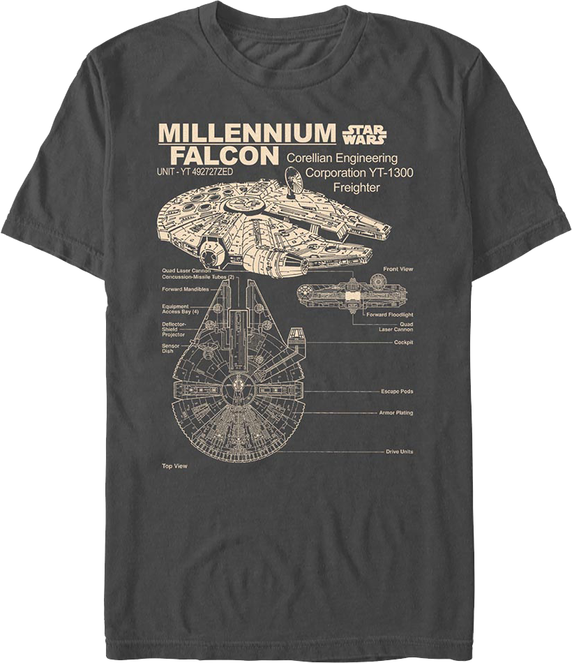 This Star Wars t-shirt shows different views and the compartments of the legendary Corellian freighter known as the Millennium Falcon.