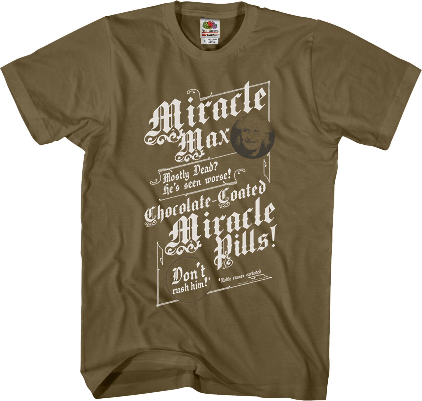 This Princess Bride t-shirt shows an image of Billy Crystal as Miracle Max and also features some of his most memorable quotes. Crystal's small scene (along with Carol Kane) helped to make The Princess Bride a true classic from the 1980's.
