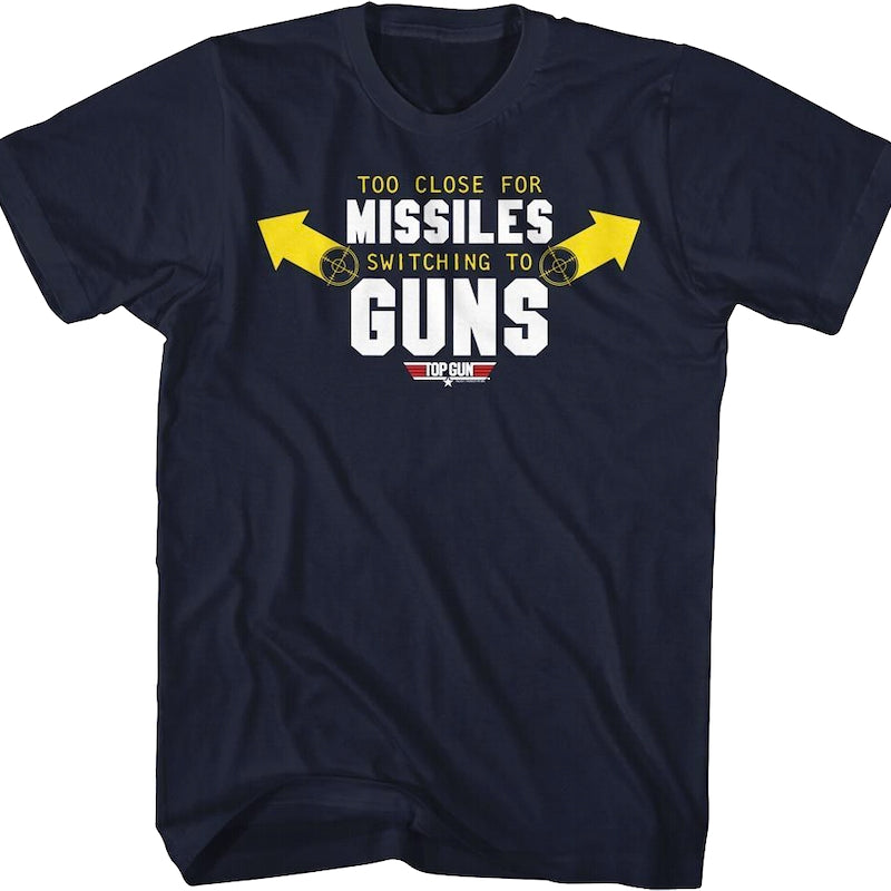 This Top Gun t-shirt shows that you're ready for a short-range attack. It claims "Too Close For Missiles, Switching To Guns", and has arrows pointing to your heavy artillery.