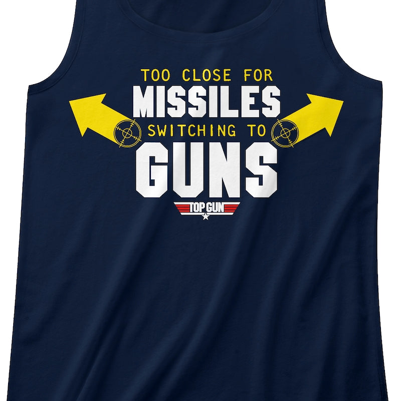 You don't have to fly a F-14A Tomcat to show off your heavy artillery! This Top Gun tank top features Maverick's classic quote, "Too close for missiles, switching to guns". The tank top includes arrows pointed at your exposed biceps. Everyone will want to be your wingman when they see you wearing this Missiles To Guns Top Gun Tank Top!