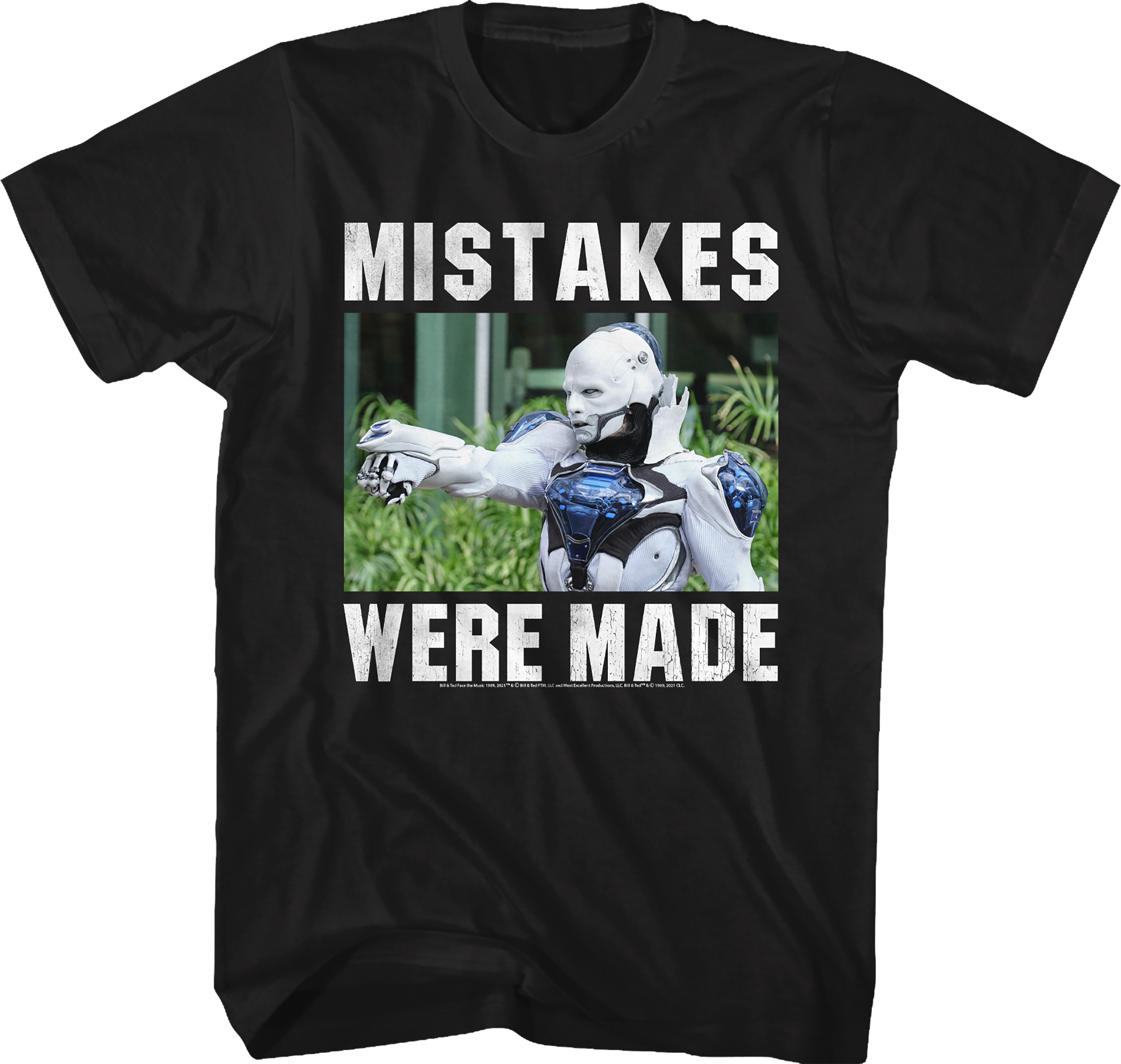 This Bill and Ted t-shirt features an image of the time-traveling robot named Dennis. The shirt reads Mistakes Were Made.