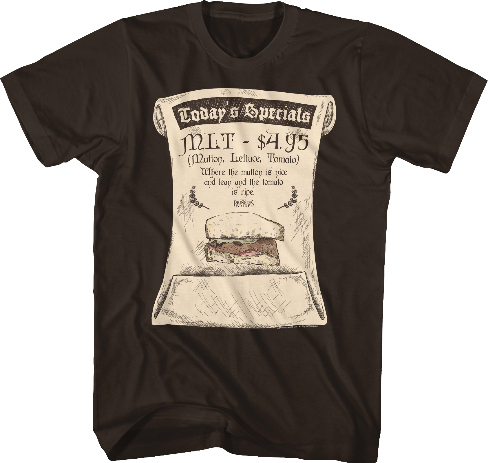 This Princess Bride t-shirt shows a menu featuring the day's special, a Mutton, Lettuce and Tomato sandwich.