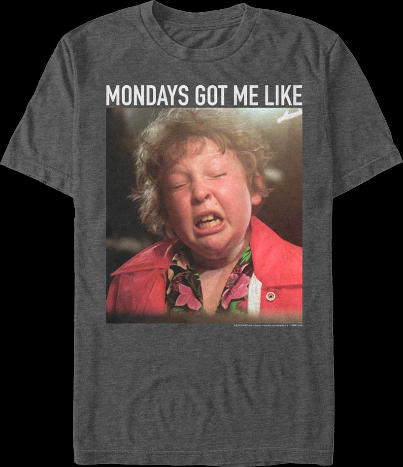 This Goonies t-shirt features an image of Chunk crying. The shirt reads Mondays Got Me Like.