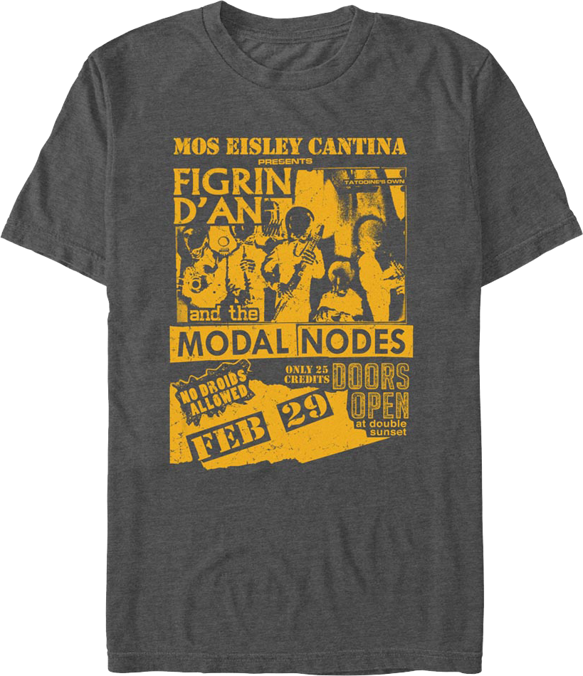 For any fan of the galactically renowned Bith band Figrin D'an and the Modal Nodes, this Mos Eisley Cantina Concert Flyer Star Wars T-Shirt is a must have!