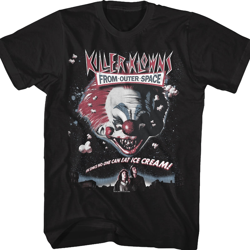 This Killer Klowns From Outer Space t-shirt features the poster artwork for the 1988 cult classic. The artwork shows popcorn surrounding the killer klown Magori as he looks down at Mike and Debbie. The shirt includes the movie's tagline, In Space No One Can Eat Ice Cream!