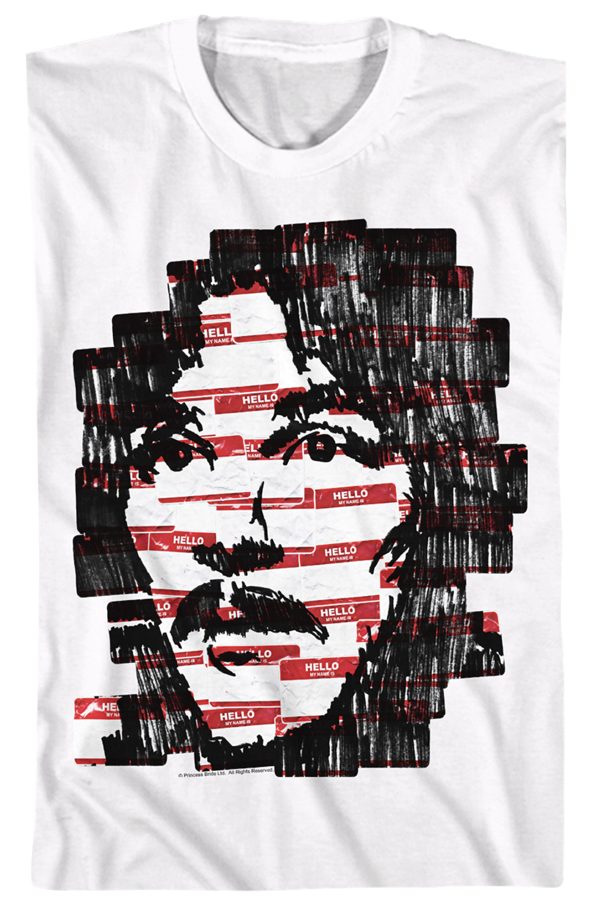 In The Princess Bride, Inigo Montoya's popular catchphrase was "Hello. My name is Inigo Montoya. You killed my father. Prepare to die". The Spanish swordsman could have eliminated part of that quote by wearing a name tag. This Princess Bride t-shirt shows a collection of name tags that have been scribbled on to make a sketch of Inigo Montoya!