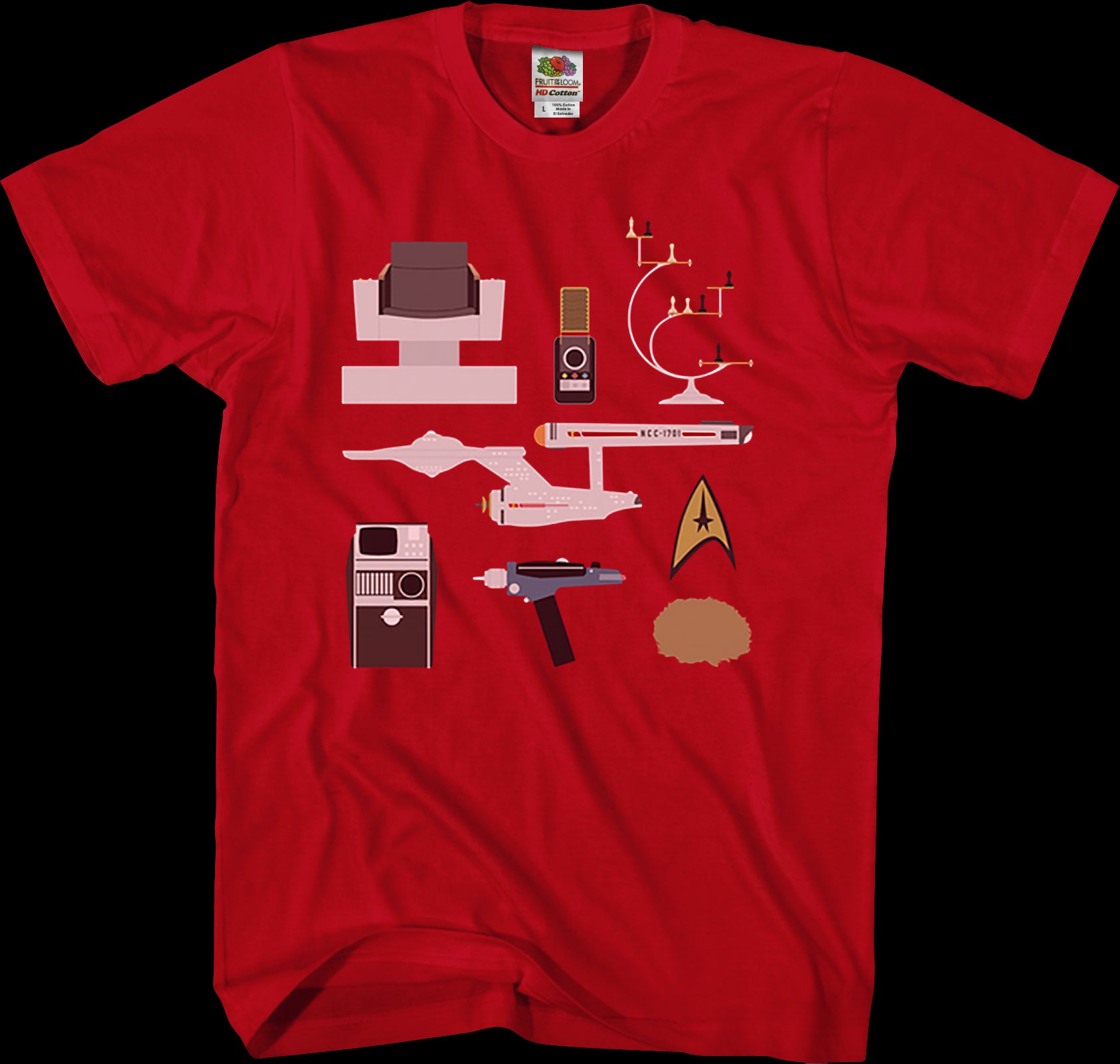 This Star Trek t-shirt shows all the necessities that any Starfleet captain would need to boldly go where no man has gone before. The shirt shows a captain's chair, a communicator, the USS Enterprise, a tricorder, a phaser, the Starfleet insignia, and a Tribble.