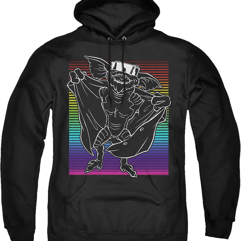 This Gremlins hoodie shows the Flasher Gremlin opening its trench coat in front of a bright, multi-color neon background. In the original Gremlins movie, the Flasher Gremlin appeared behind the counter in Dorry's Tavern, where it flashed Kate Beringer. In "Gremlins 2: The New Batch", the Flasher Gremlin flashed Kate again, this time in New York City. At the end of the movie, the gremlin was destroyed by the Electric Gremlin.
