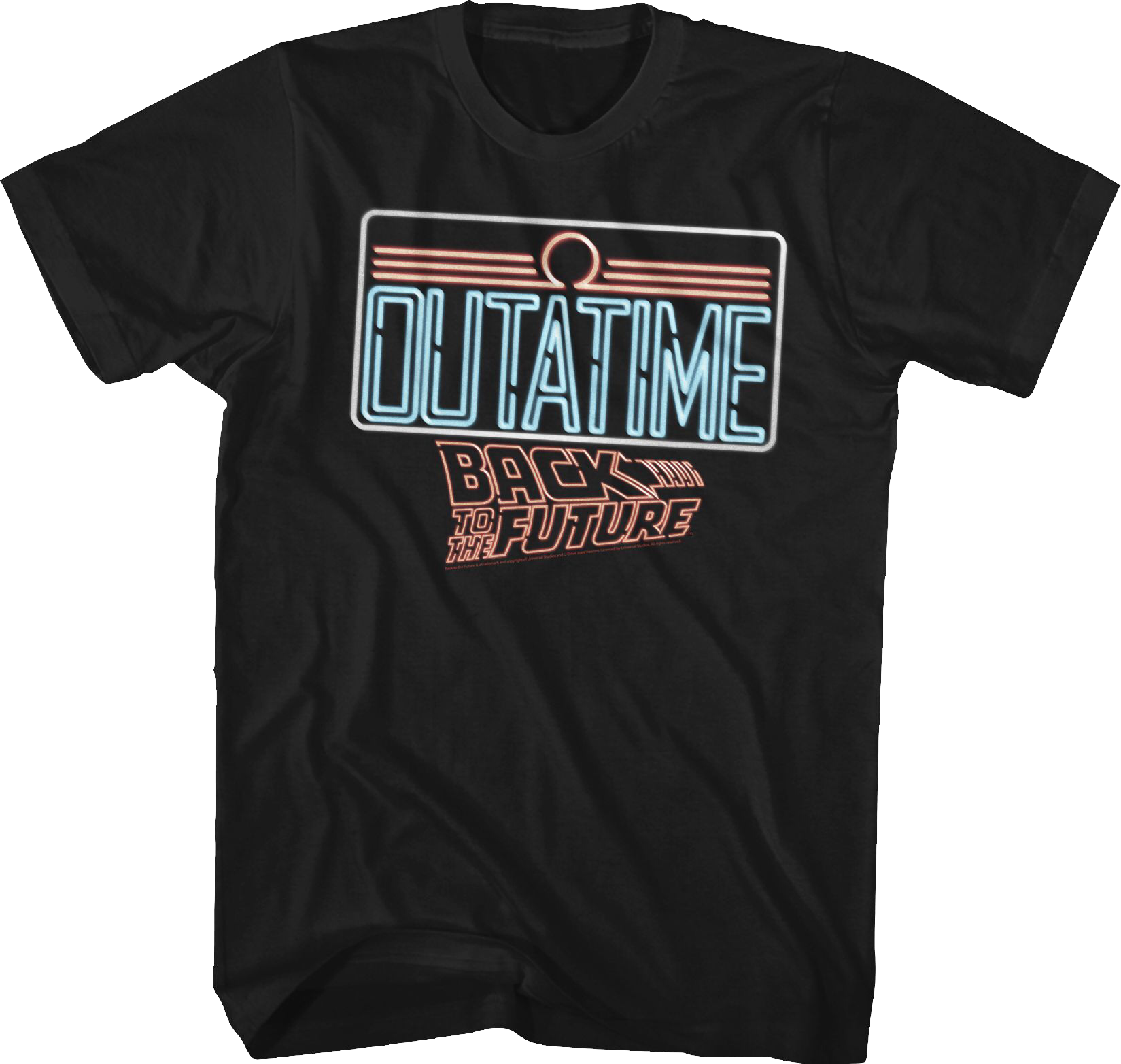 This Back To The Future t-shirt features a neon image of the OUTATIME license plate that appeared on Doc Brown's DeLorean.