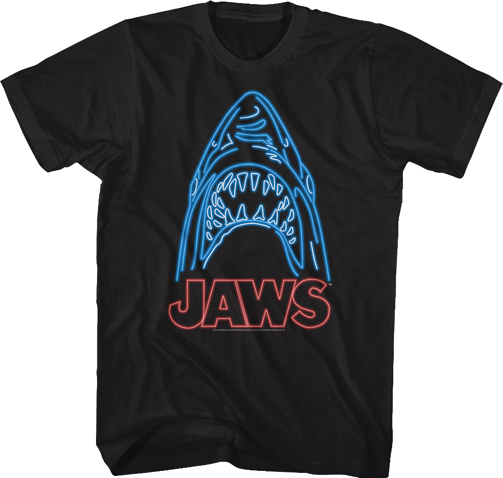 This Jaws t-shirt features a neon image the great white shark that terrorized Amity Island in the Steven Spielberg classic.