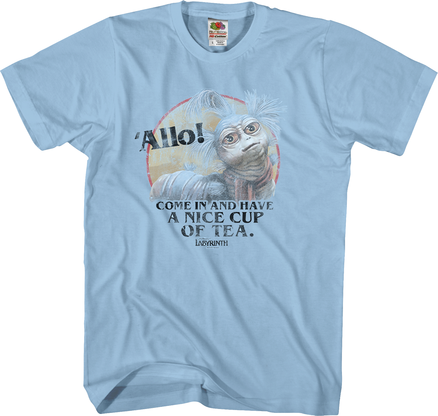 This t-shirt features an image of the worm from Labyrinth. The shirt shows the worm's quote 'Allo! It's not hello, but it's close enough. The shirt reads Come In And Have A Nice Cup Of Tea.