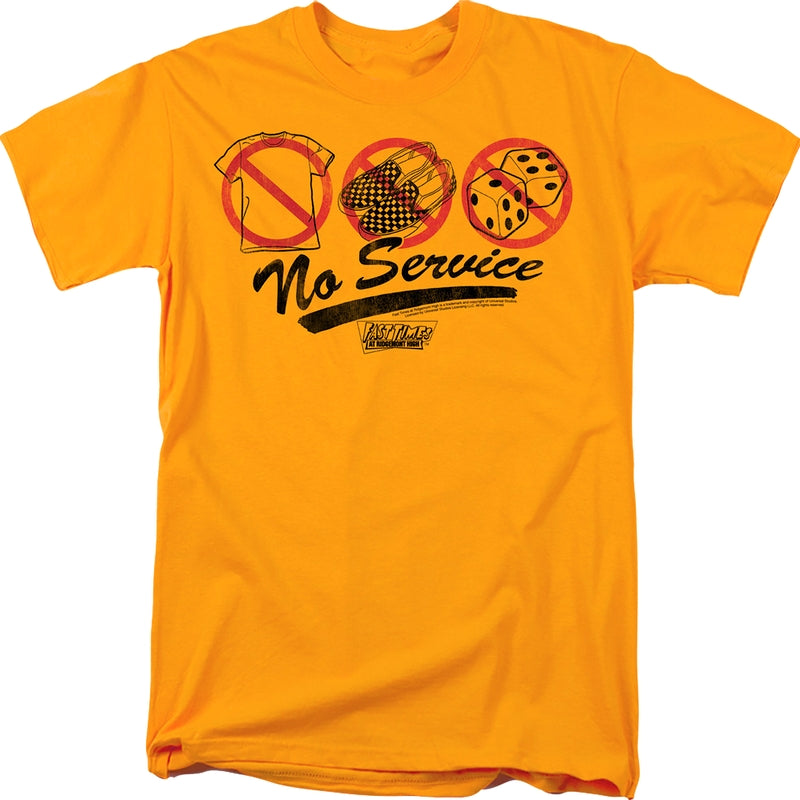 This Fast Times At Ridgemont High t-shirt shows All-American Burger's policy for their customers, "No shirt, no shoes, no dice". This means no service for anyone not wearing their shirt and shoes. Spicoli and his buds found this out the hard way in the 1982 classic. Let everyone know you are a fan of the hilarious comedy starring Sean Penn and Judge Reinhold with this No Service Fast Times At Ridgemont High T-Shirt.