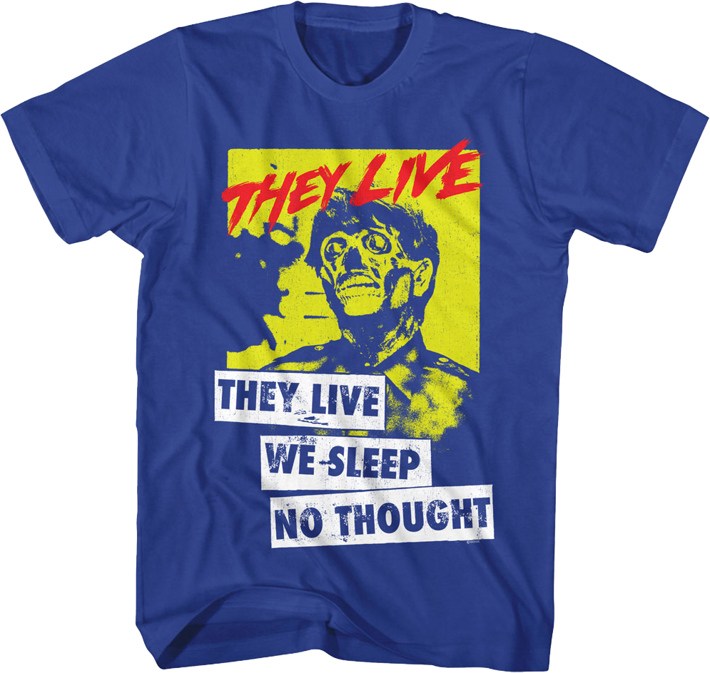 This They Live t-shirt shows an alien, and includes the messages "They Live", "We Sleep", and "No Thought."