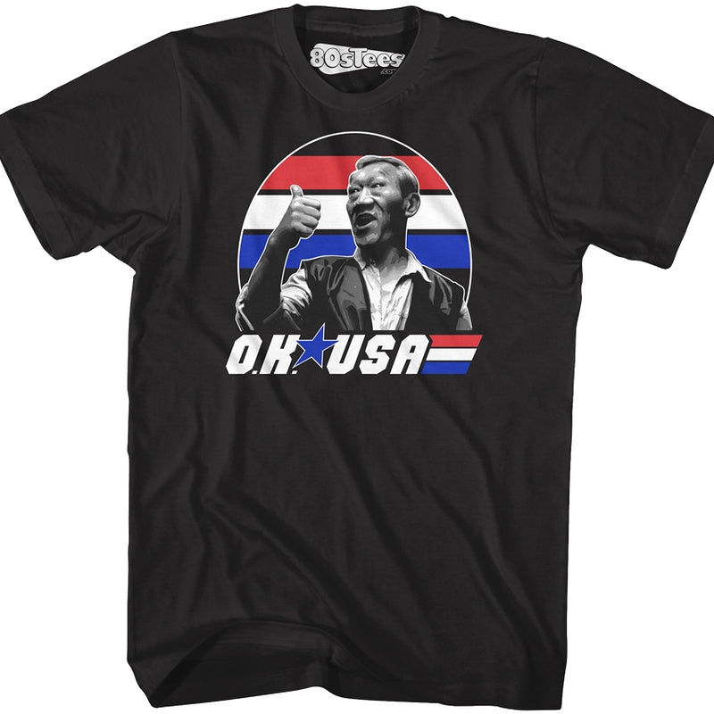 The old man appears on this 80sTees.com exclusive Bloodsport t-shirt with his unforgettable quote "O. K. USA". The quote is designed to look like the GI Joe logo, and red, white and blue stripes appear behind the old man.