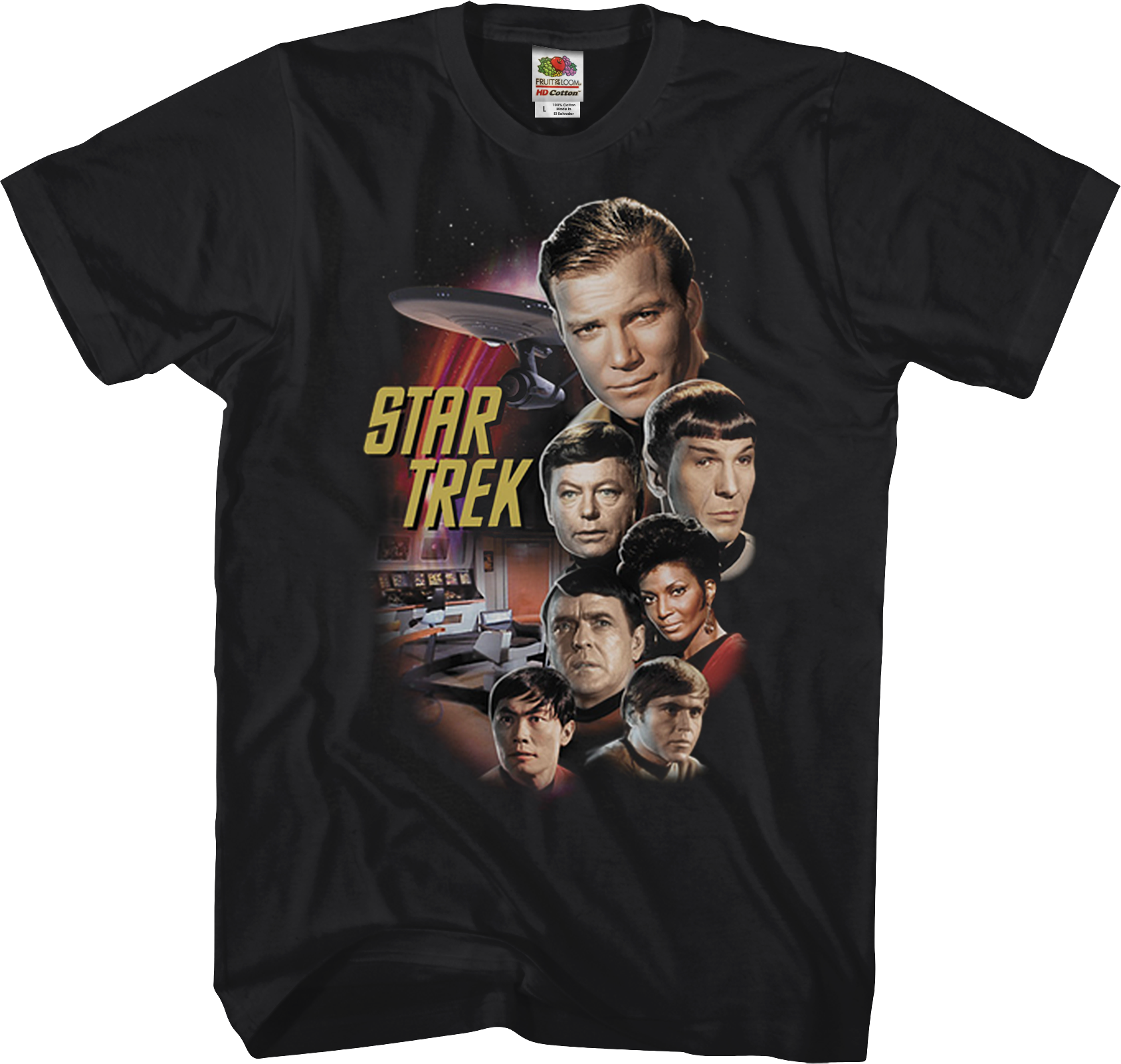 This Star Trek t-shirt features the original series characters Captain James T. Kirk, Leonard McCoy, Spock, Nyota Uhura, Montgomery Scott, Pavel Chekov, and Hikaru Sulu. These are the characters that boldly went where no one had gone before!