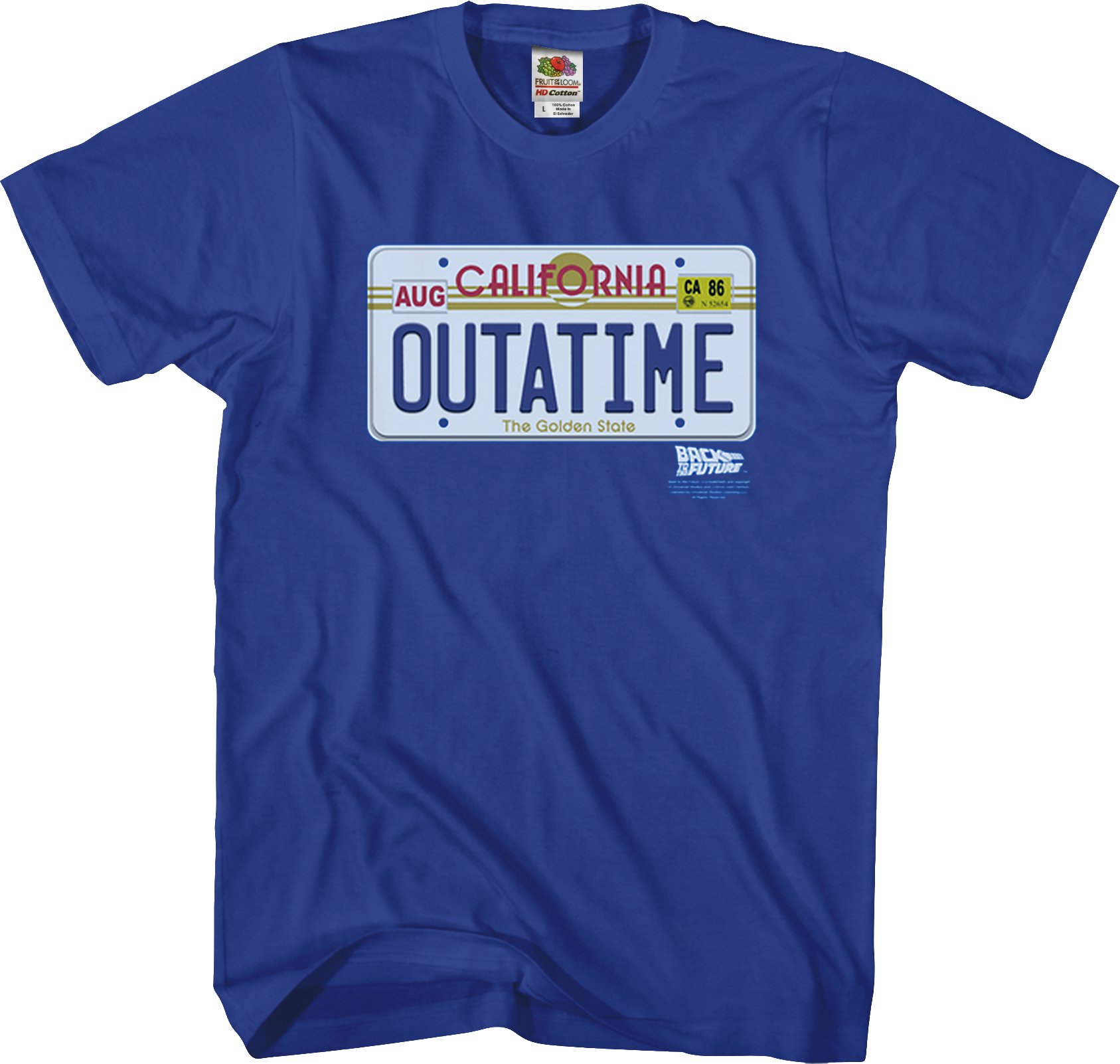 This Back To The Future t-shirt features an image of Doc Brown's vanity license plate for his time traveling DeLorean. The California license plate reads OUTATIME.