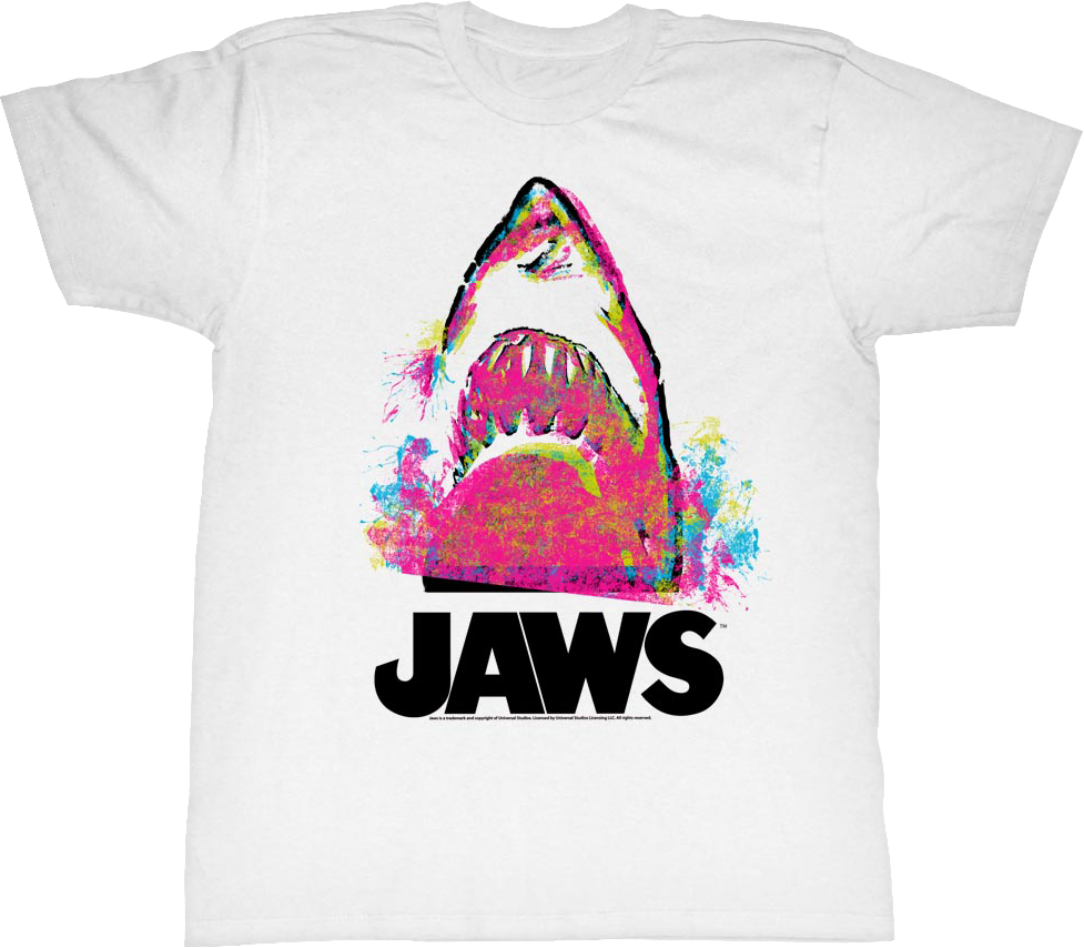 This Jaws t-shirt shows a colorful painting of a great white shark rising from the water to attack its next victim.