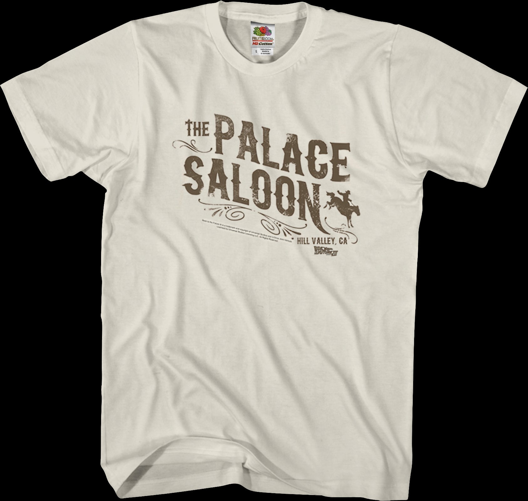 This Back To The Future t-shirt features the logo for the Palace Saloon in Hill Valley, California.