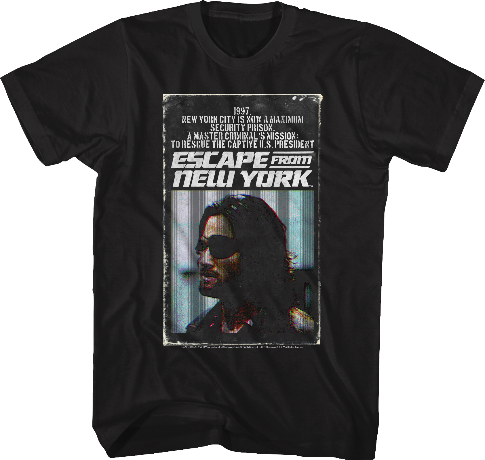 This t-shirt shows Snake Plissken on the cover of the paperback novelization of the 1981 movie starring Kurt Russell, Escape From New York.