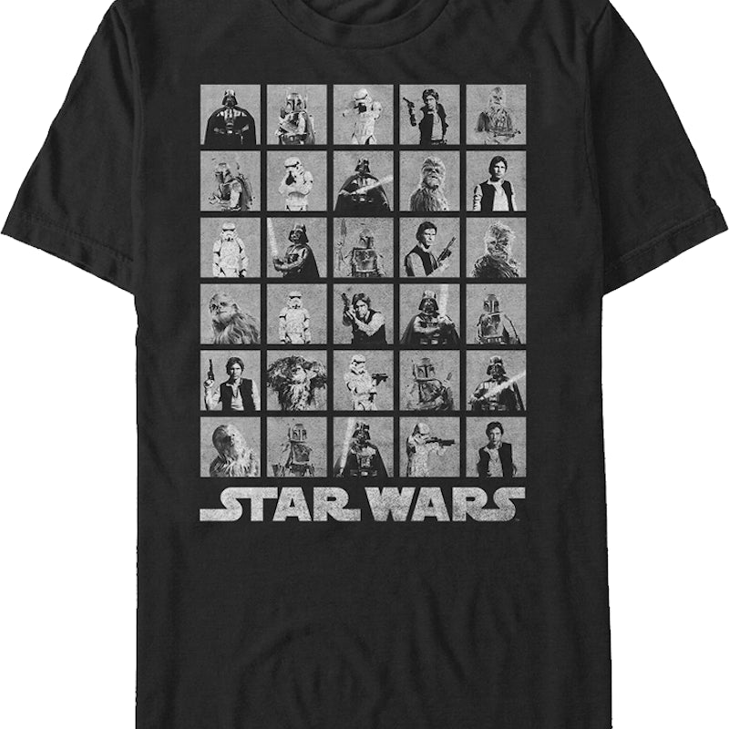 This Star Wars t-shirt shows Darth Vader, Boba Fett, a Stormtrooper, Han Solo and Chewbacca striking several poses for a black and white photo shoot. These are the unforgettable characters that made Star Wars the greatest space saga of all time!