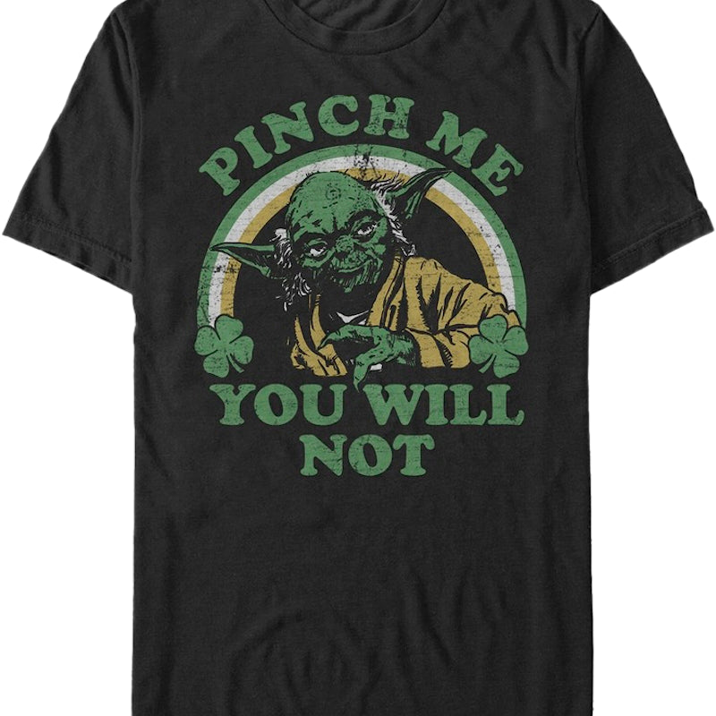 This shirt features an image of Yoda surrounded by a rainbow and four-leaf clovers. The shirt reads Pinch Me You Will Not.