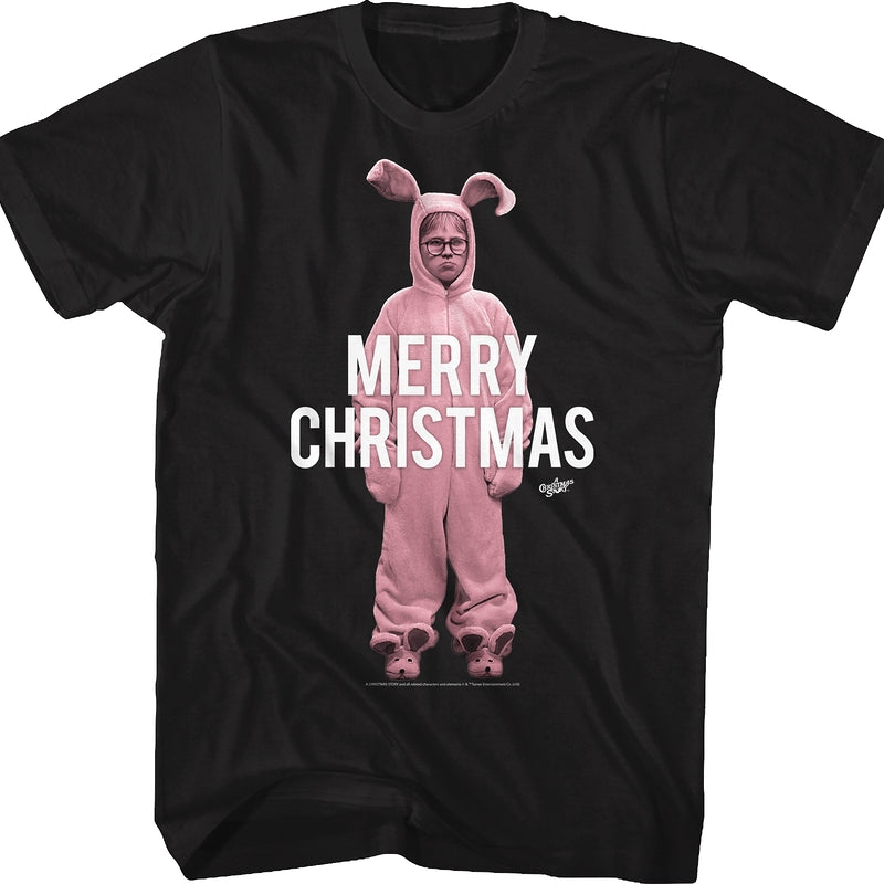 'Tis better to give than to receive. This was Aunt Clara's thinking when she made a pink Easter Bunny outfit for Ralphie in the 1983 holiday comedy A Christmas Story. This shirt shows Ralphie wearing the pink nightmare and the shirt reads Merry Christmas. For any fan of A Christmas Story, this Pink Bunny shirt is a must have. No one will look at you as if you had lobsters crawling out of your ears as long as you're wearing this Merry Christmas shirt.
