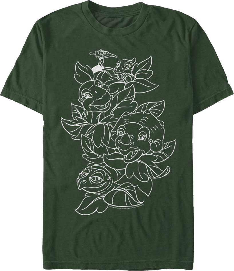 This Land Before Time t-shirt features sketches of Petrie, Ducky, Littlefoot, Cera, and Spike in the plant life of the Great Valley.
