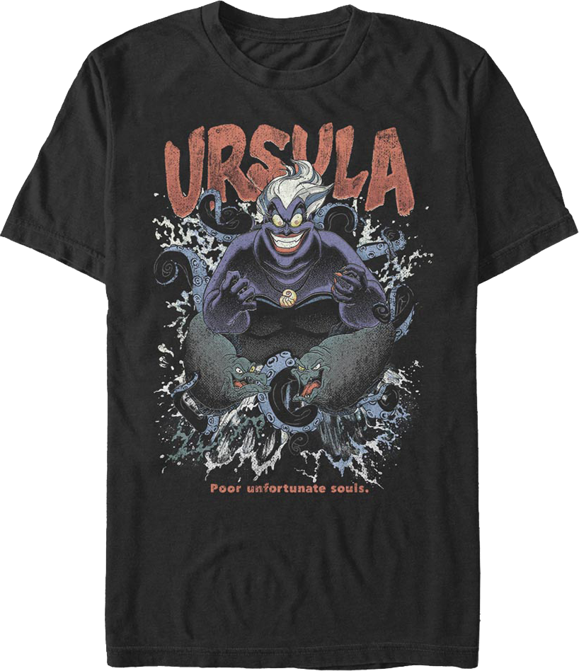 In The Little Mermaid, Ursula is a villainous Cecaelia who sings "Poor Unfortunate Souls", a song she uses to trick and manipulate Ariel into making a deal with her so Ursula may become human. Ursula is one of the greatest villains in the history of Disney films, and everyone will know you are a fan when you wear this Poor Unfortunate Souls Little Mermaid T-Shirt.