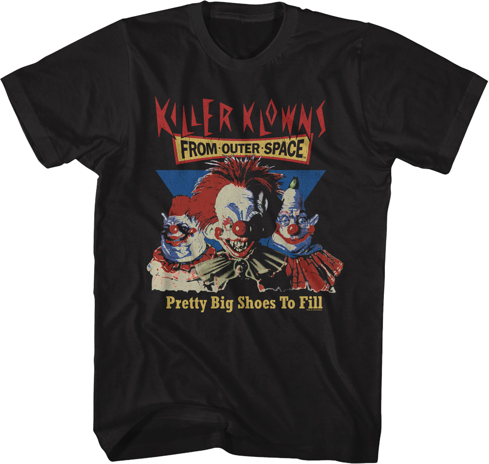 This Killer Klowns From Outer Space t-shirt features images of Fatso, Magori and Jumbo. The shirt reads Pretty Big Shoes To Fill.