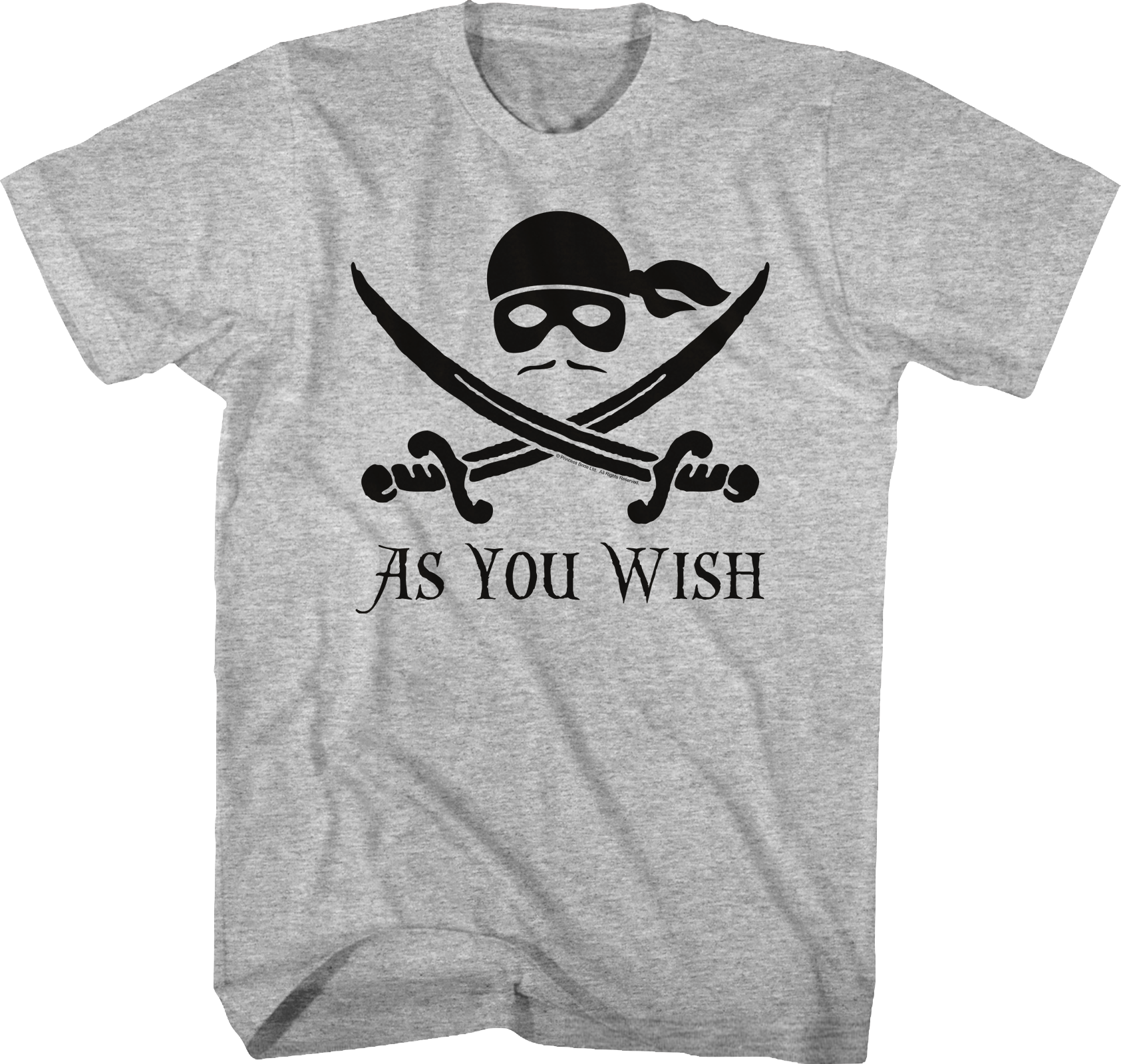 This Princess Bride shirt features the Dread Pirate Roberts mustache, mask, and bandana as well as the quote "As You Wish".