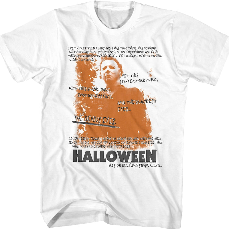 This Halloween t-shirt features an image of Michael Myers, and Dr. Loomis's chilling quote about meeting Michael as a six-year-old child who had no understanding of life or death, good or evil, right or wrong. He had the devil's eyes, and he was purely and simply evil.