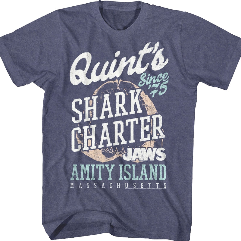 For any fan of Steven Spielberg's 1975 classic starring Roy Scheider, Richard Dreyfuss, and Robert Shaw, this Quint's Shark Charter Jaws T-Shirt is a must have!
