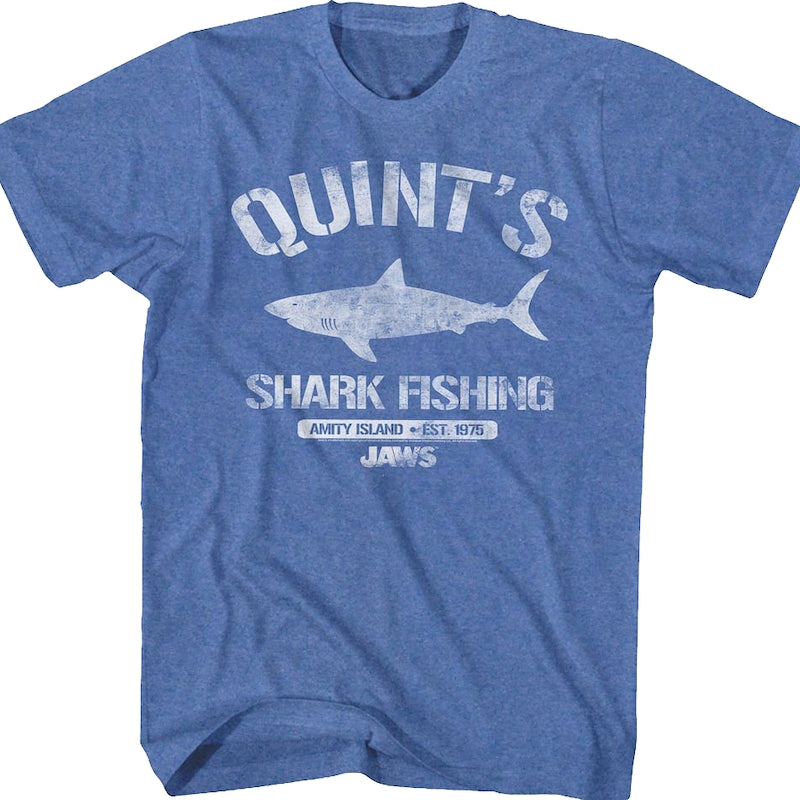 For any fan of Steven Spielberg's 1975 classic starring Roy Scheider, Richard Dreyfuss, and Robert Shaw, this Quint's Shark Fishing Jaws T-Shirt is a must have!
