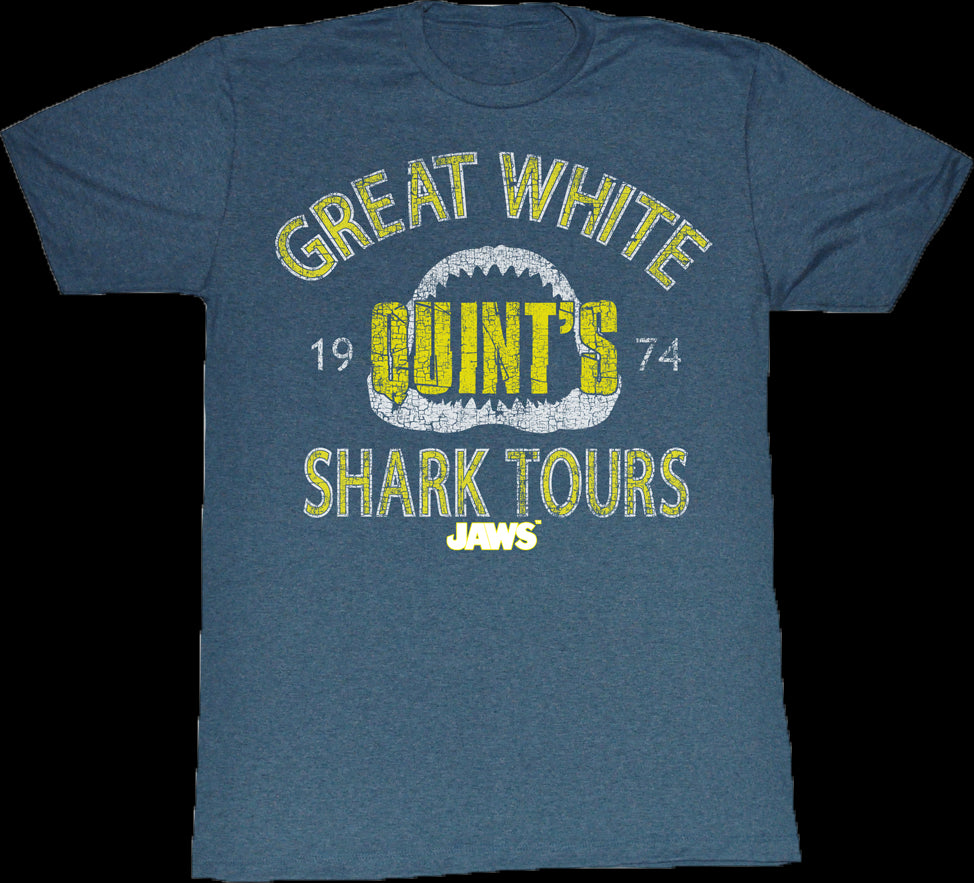Had he survived his encounter with the shark that terrorized Amity Island, tough-as-nails fisherman Quint probably would have started a tourist trade. This Jaws shirt advertises Quint's Great White Shark Tours.