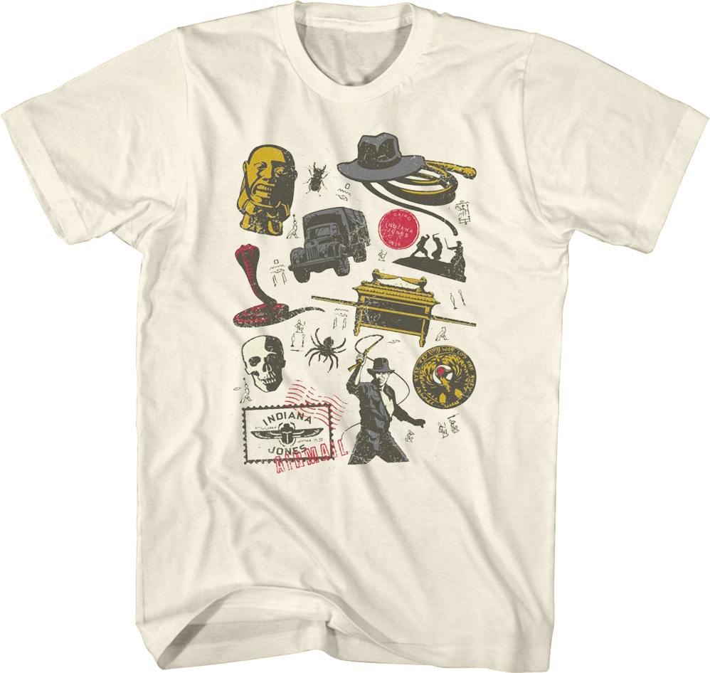 This Indiana Jones t-shirt features iconic images from the 1981 Raiders of the Lost Ark. In this action-packed film, archaeologist Indiana Jones goes head-to-head with Nazi German forces, as he tries to stop them from getting their hands on the Ark of the Covenant, which is said to make an army invincible.