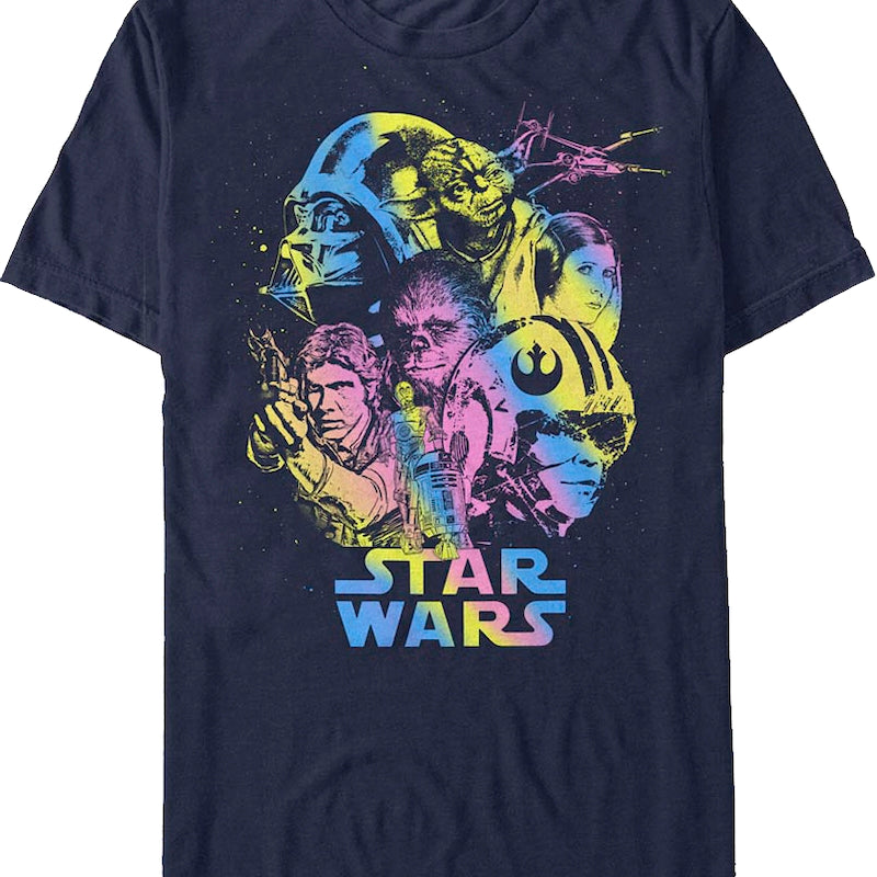 For any fan of the movie that started the most successful franchise film of all time, this Rainbow Collage Star Wars T-Shirt is a must have!