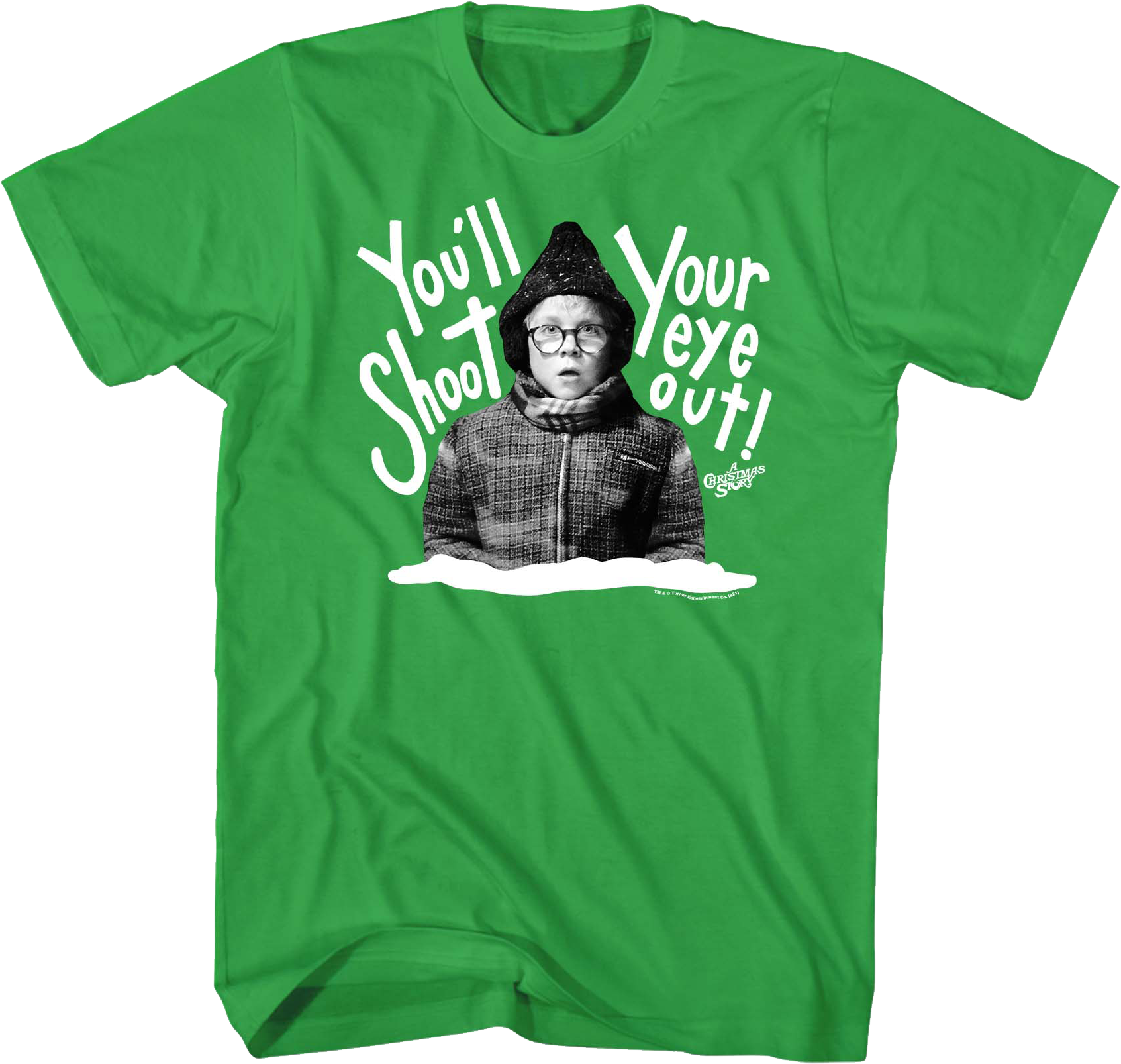 This A Christmas Story t-shirt features an image of Ralphie Parker, and includes the classic quote, "You'll Shoot Your Eye Out!"